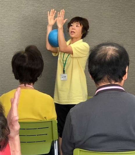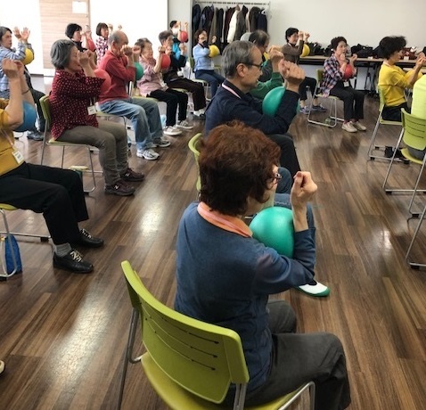 特に、やはり人気は本杉トレーナーの笑って無理しない運動の時間です。少し辛くなるはずの体操だったりしますが、本杉トレーナーの軽快なトークを交えた運動時間はあっという間の一時間です。本日は転びそうなときにつかむ力ということで、胸、腕の力を鍛える運動に取り組みました。逆三角形の形で腕でボールをつかむ動き・・・簡単そうなのにやはり肩周りも柔らかくないとなかなか力が入って上手くつかめない。高さを少し変えるだけでも、負荷が全然違って興味深かったです。