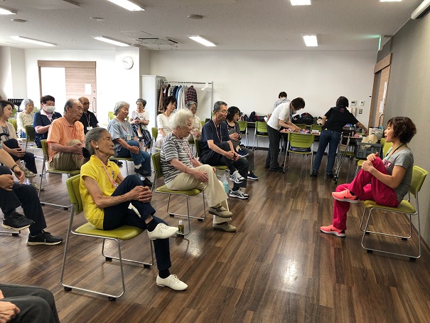 イスに座ったまま、お尻で座面を進むお尻体操、肩甲骨を寄せながら行う胸の筋肉をきたえる体操、あばらを広げる運動などつなげて曲に合わせ動かします。