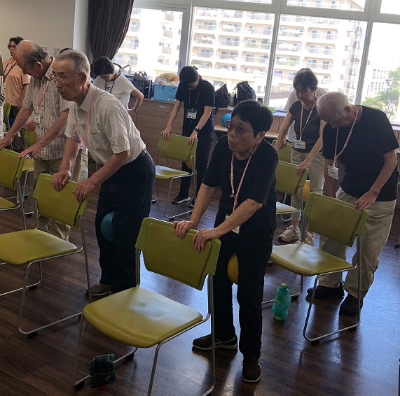 また、ボールを膝に挟んで立ち、左右の母指球を交互に意識しながら身体を横に揺らす。外側に逃げがちになる力を母指球を意識することで、転倒予防体操の動きの時にわかりやすくなるとのこと。