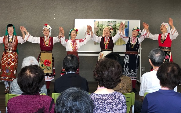 いつもの転倒予防体操をしっかりと一時間汗を流して、フッ―と一息、第二部のイベントはブルガリア舞踊集団のコプチェの皆さんによる、ブルガリアのダンスです。