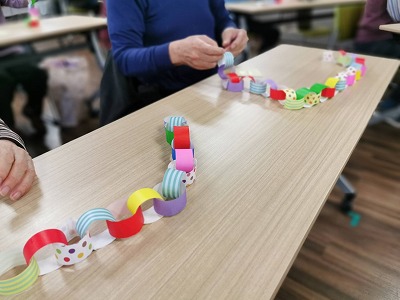 今年最後となる12/22(木)に、ささやかなクリスマス会を予定しています。その日の飾り付け用のお飾りでして、折り紙を輪っかにして糊でつなげる「輪つなぎ」を作りました。