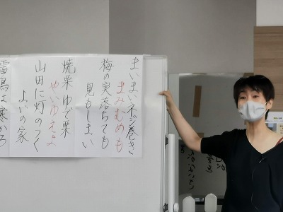 はじめに、活舌の練習から。「ま・み・む・め・も」など一文字ずつ口をしっかり動かして嚥下(えんげ)体操を行いました。自宅で毎日5分間続けることで、誤嚥(ごえん)予防になるそうです。ぜひ、続けてみてください。