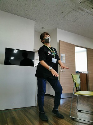 「イチ・ニ・サンからシ」と続かずに「イチ・ニ・サン~」でモモを上げた状態でストップ(片足立ち)するなど、いつもと違う動きに戸惑いながらも楽しそうに運動されていました。