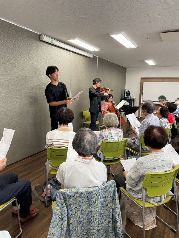 先日もお越しいただいたオペラ歌手の草間さんも加わり、エーデルワイス、埴生の宿を歌いました。バイオリンやチェロと聞くと少し敷居が高く感じますが、こんなに近い距離で弦から響く音色に心も充分癒されました。