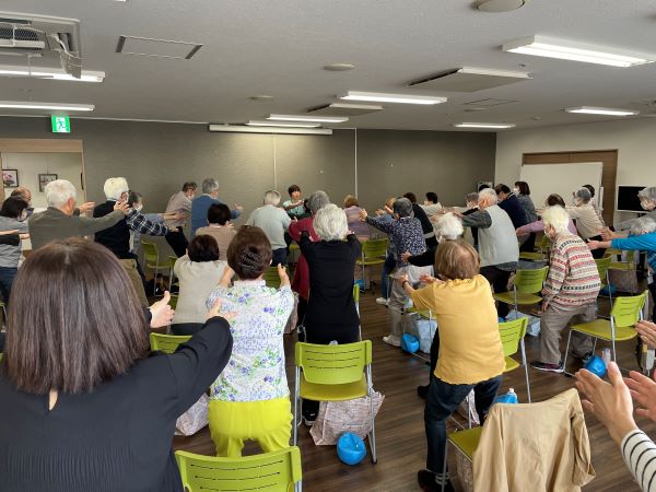 久しぶりの紹介写真アップです。見てお分かりの通り、多くの方が本杉トレーナーの体操を楽しみに参加いただいています。ボールを使ったり椅子を使ったりしながらコロナ中は少し控えていた立っての体操なども行っています。興味のある方はぜひ、ケアプラザまでお問い合わせください。