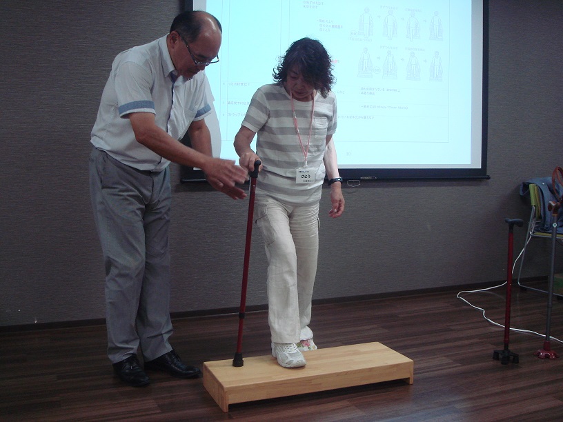参加者さんが杖をついて階段をのぼるという動作を体験したりしました。